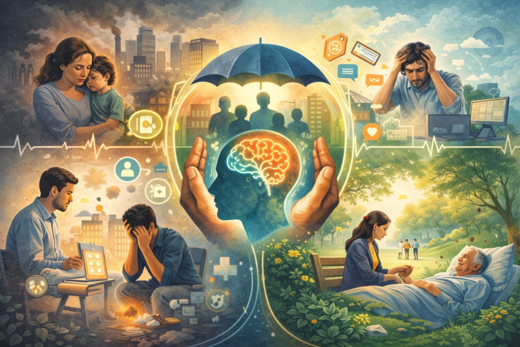 Research on mental stability, early intervention systems, caregiver support, and societal stress factors affecting human wellbeing.