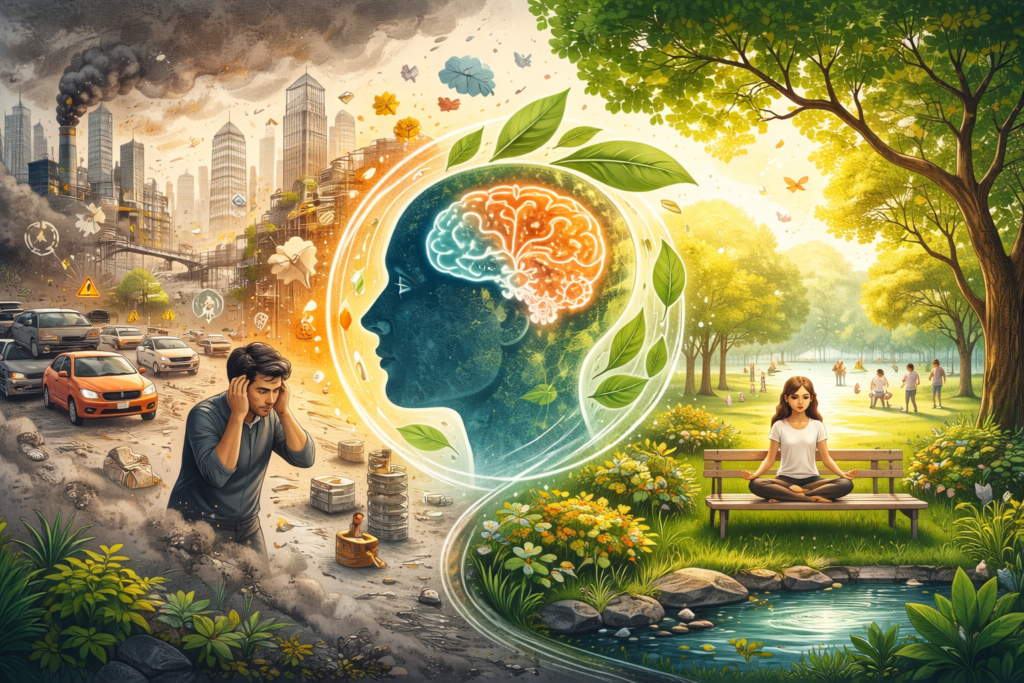 Research on how environmental conditions – such as pollution, urban design, noise, and green spaces – affect cognition, emotional stability, and long-term mental health.